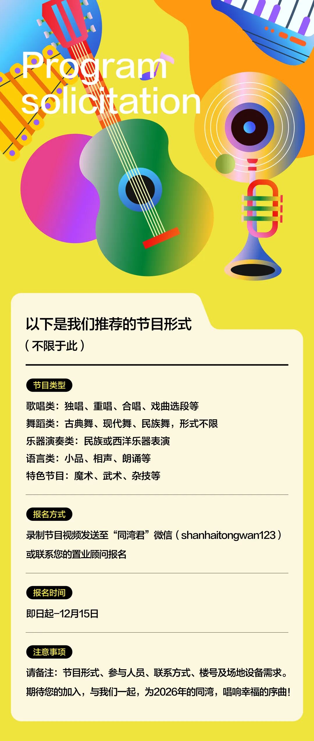 告别金秋,美好的同湾,精彩的同湾,忙碌的同湾人——2026同湾新年业主联谊会节目征集正式开启!